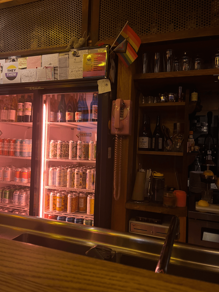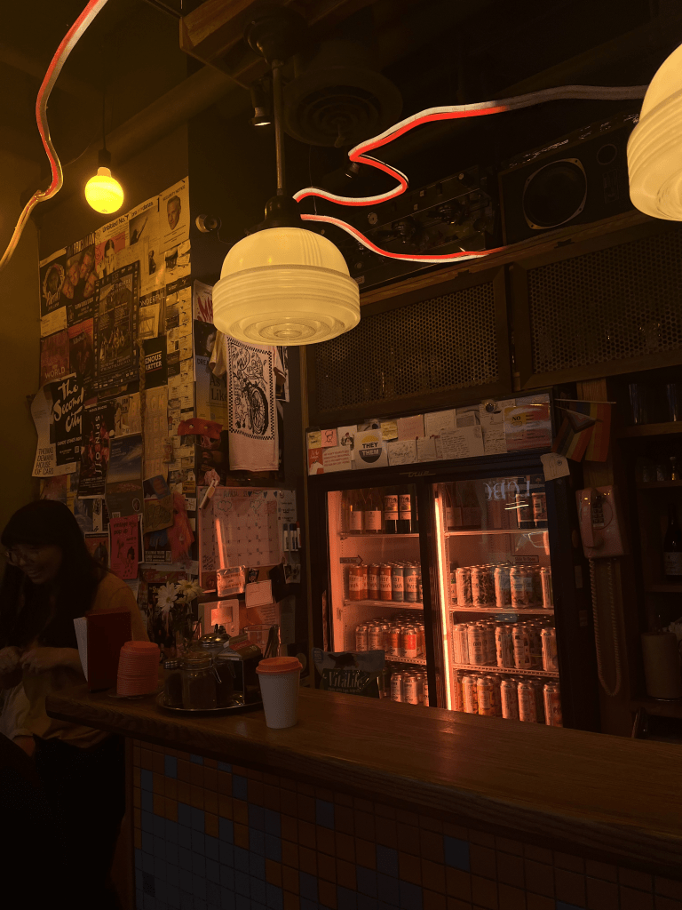 the walls are decorated with neon lights and local artist’s work, which creates a fun, vintage feel to the spot. because it’s a smaller space, there is minimal seating, but in the warmer months there are a couple tables outside that serve as makeshift patio.